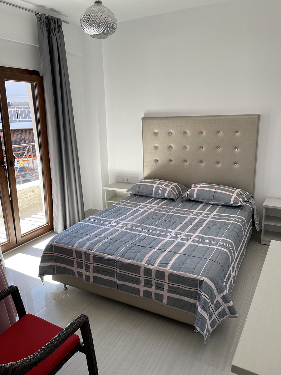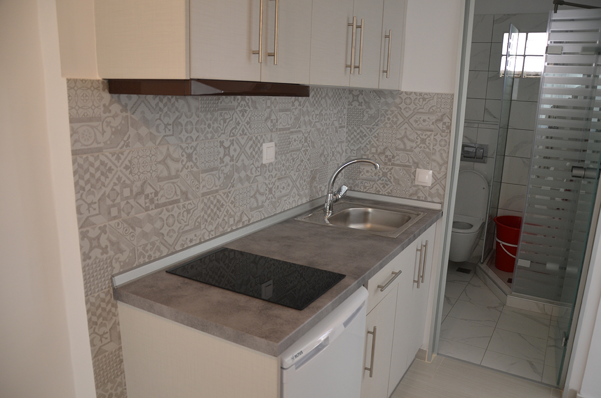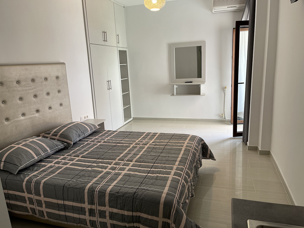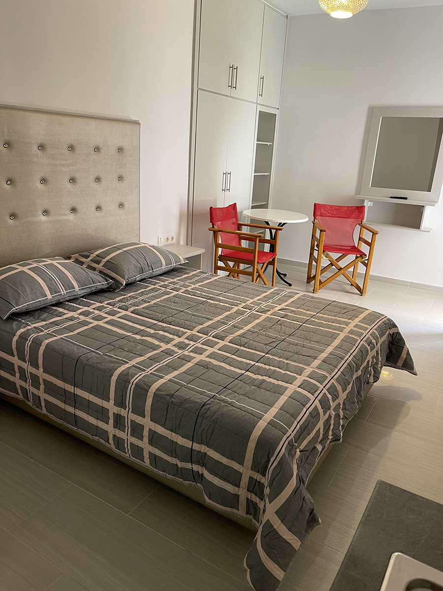 DVOKREVETNI STUDIO: Sastoji se od francuskog ležaja dimenzija (160X200cm), ormara, noćnog stočića sa ogledalom, TV/KAT, klima uređaja (BESPLATNO). Kuhinja je u potpunosti opremljena posuđem za dve osobe, aspiratorom, šporetom sa dve ringle i frižiderom. Prelepo kupatilo je sa tuš kabinom, fenom za kosu. Svaki studio poseduje terasu sa stolom i dve stolice.