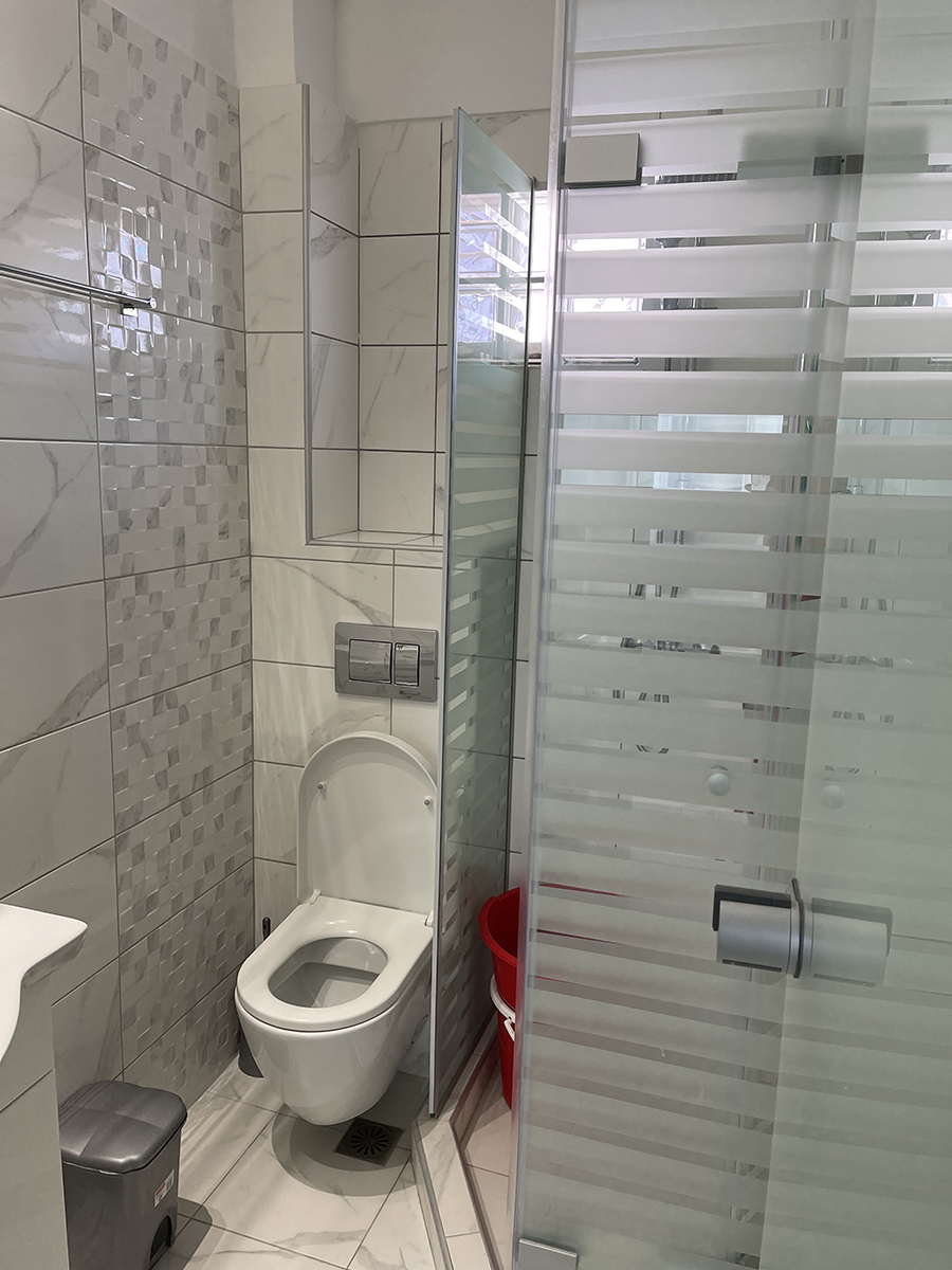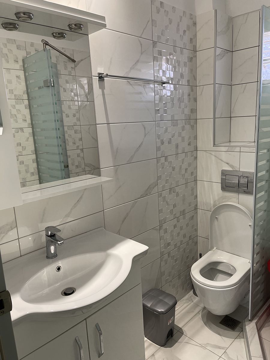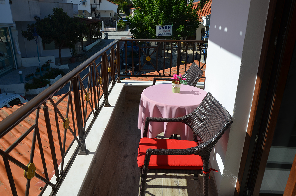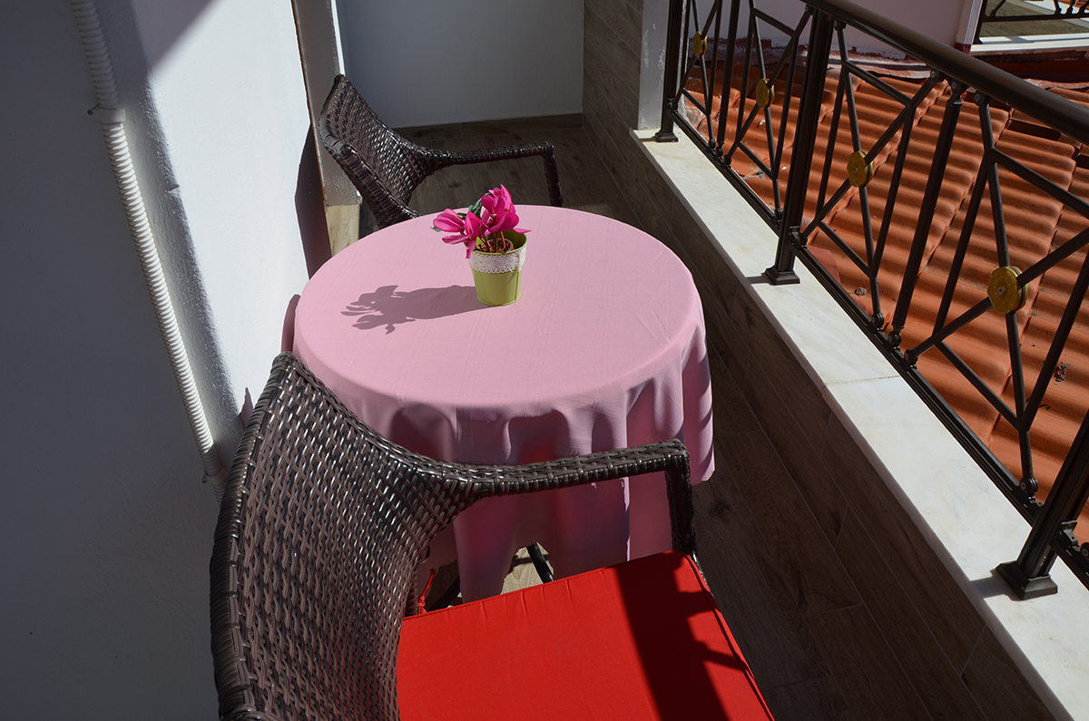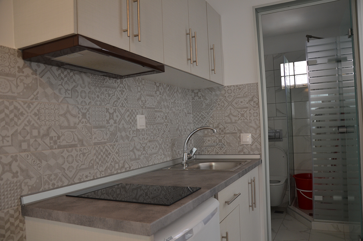 DVOKREVETNI STUDIO: Sastoji se od francuskog ležaja dimenzija (160X200cm), ormara, noćnog stočića sa ogledalom, TV/KAT, klima uređaja (BESPLATNO). Kuhinja je u potpunosti opremljena posuđem za dve osobe, aspiratorom, šporetom sa dve ringle i frižiderom. Prelepo kupatilo je sa tuš kabinom, fenom za kosu. Svaki studio poseduje terasu sa stolom i dve stolice.